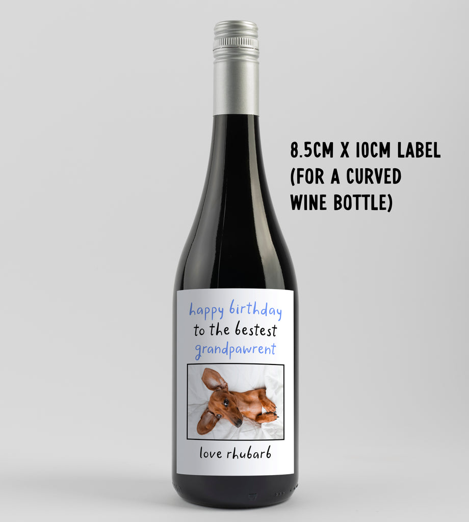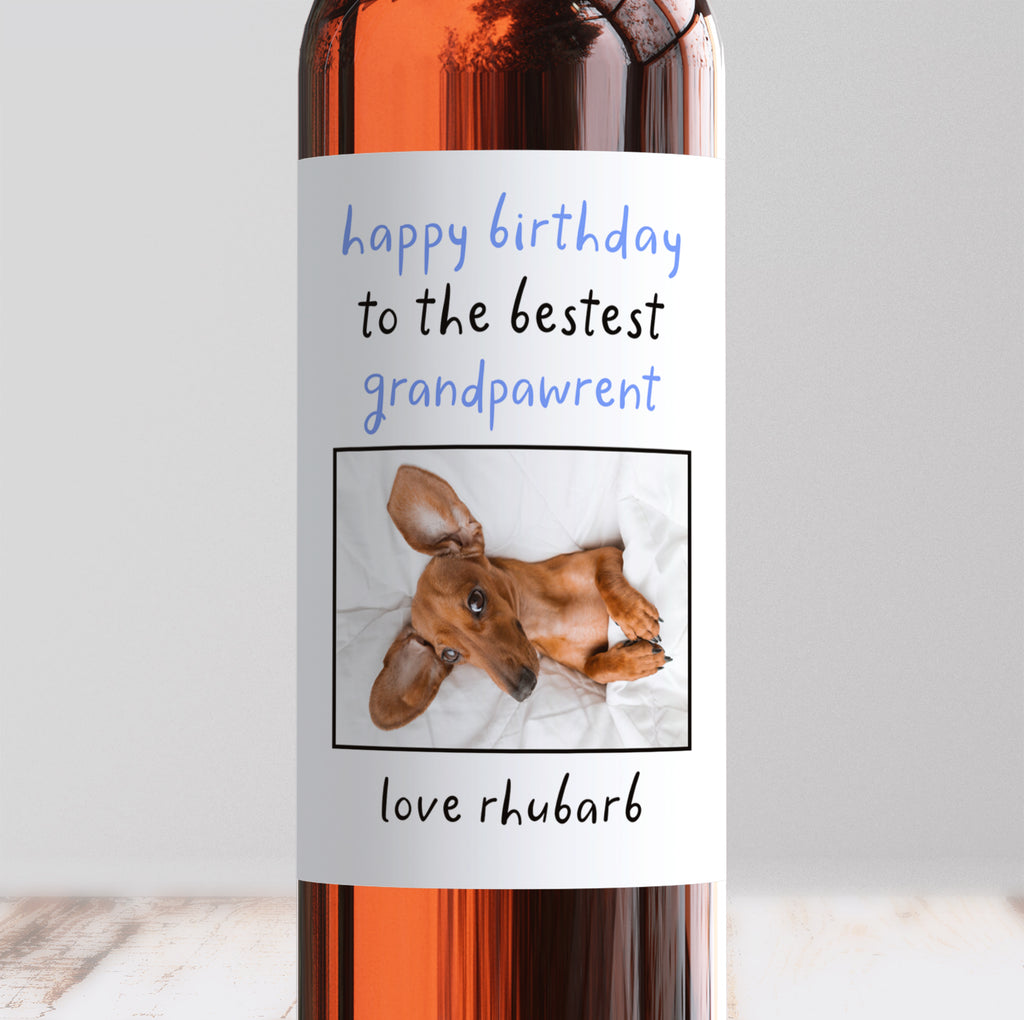 Show your pup's grandparent just how much they’re appreciated with this personalised birthday wine label - the perfect way to brighten their special day. The design features the sweet message “Happy Birthday To The Bestest Grandpawrent”, alongside a space for your dog’s photo and their name. It turns any bottle of wine into a thoughtful and personal birthday gift from their four-legged friend.